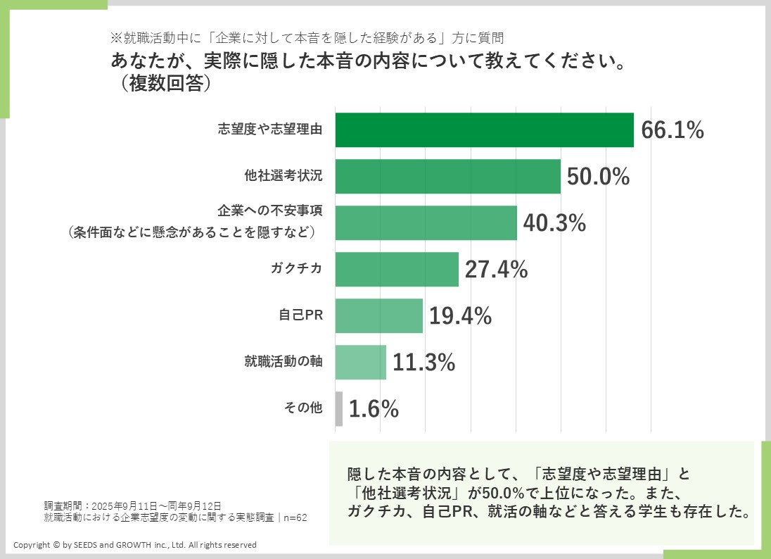 実際に隠した本音のTOP3は、1位「志望度や志望理由」(66.1%)、2位「他社選考状況」(50.0%)、3位「企業への不安事項」(40.3%)でした。