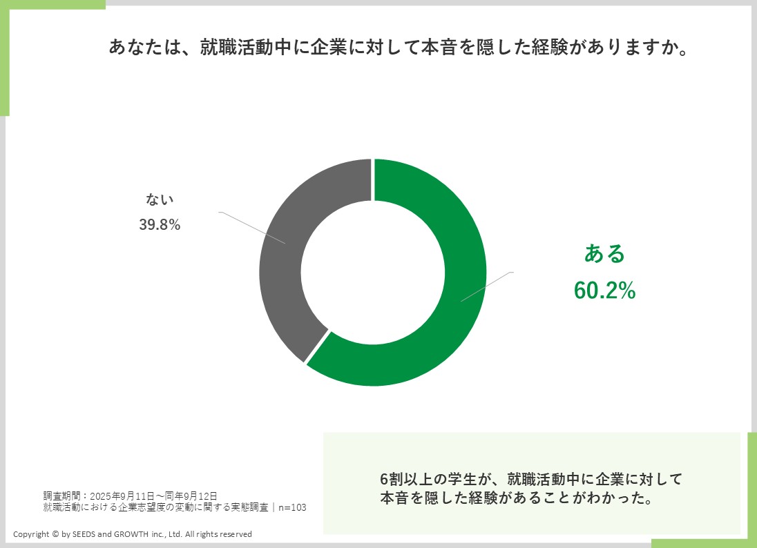 新卒採用に特化したコンサルティング会社のシーズアンドグロース株式会社(本社所在地:東京都中央区、代表取締役:河本 英之)は、26卒の「就職活動における企業志望度の変動」について調査を行いました。その結果、選考中に「企業に本音を隠した経験がある」学生は対象者の約6割に上りました。