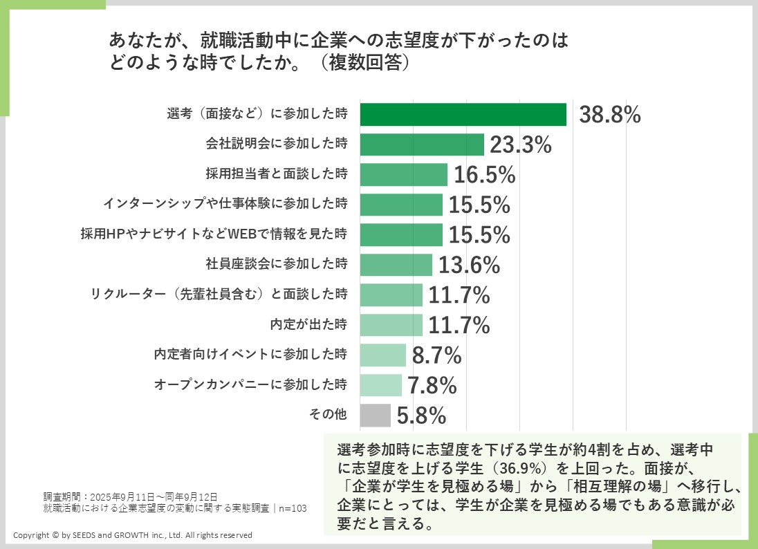 志望度についても、選考の早い段階から第一志望と言い続けてくれている学生だからといって安心はできません。約4割の学生が、「選考(面接など)に参加した際に、企業への志望度が下がったことがある」と回答しています。